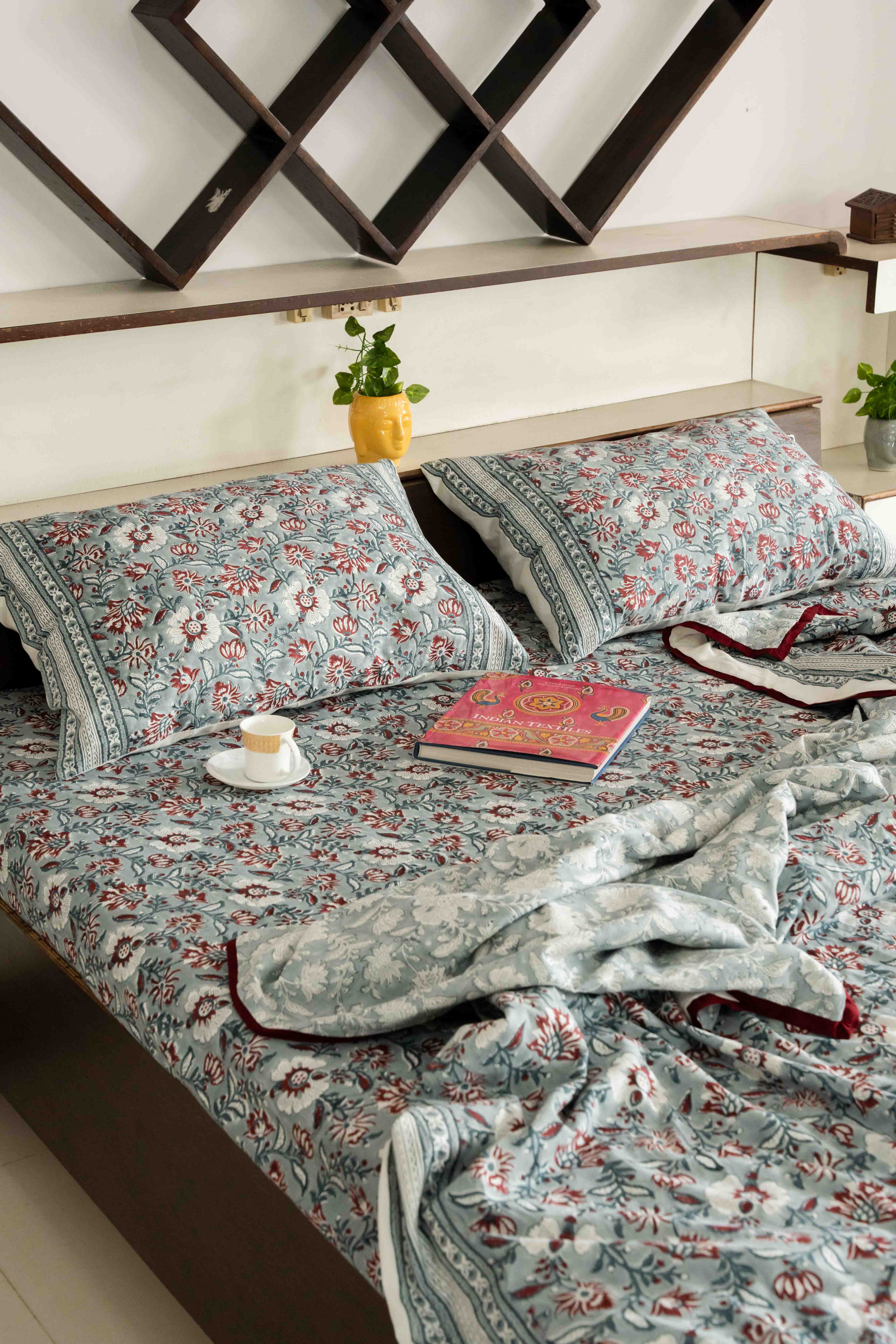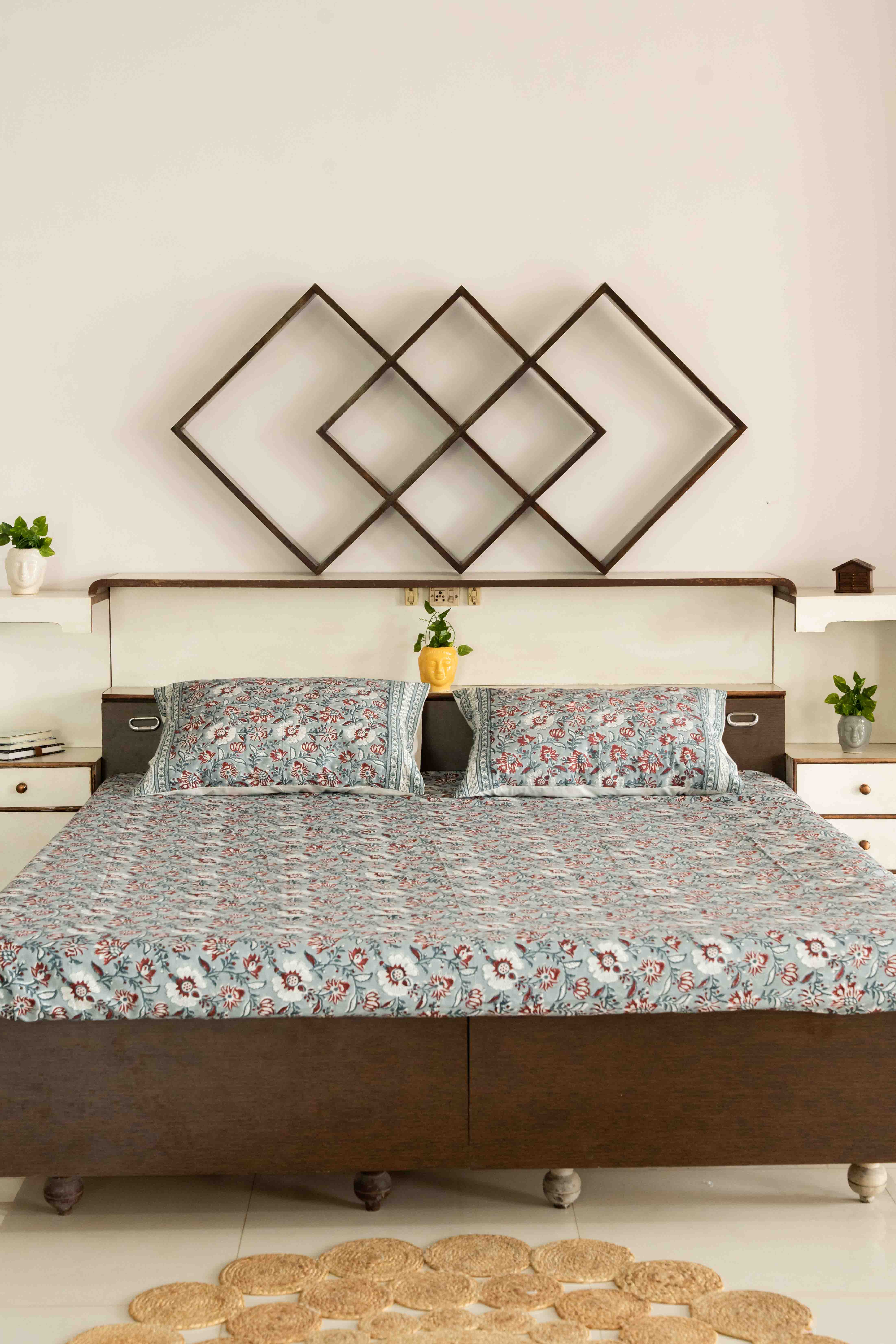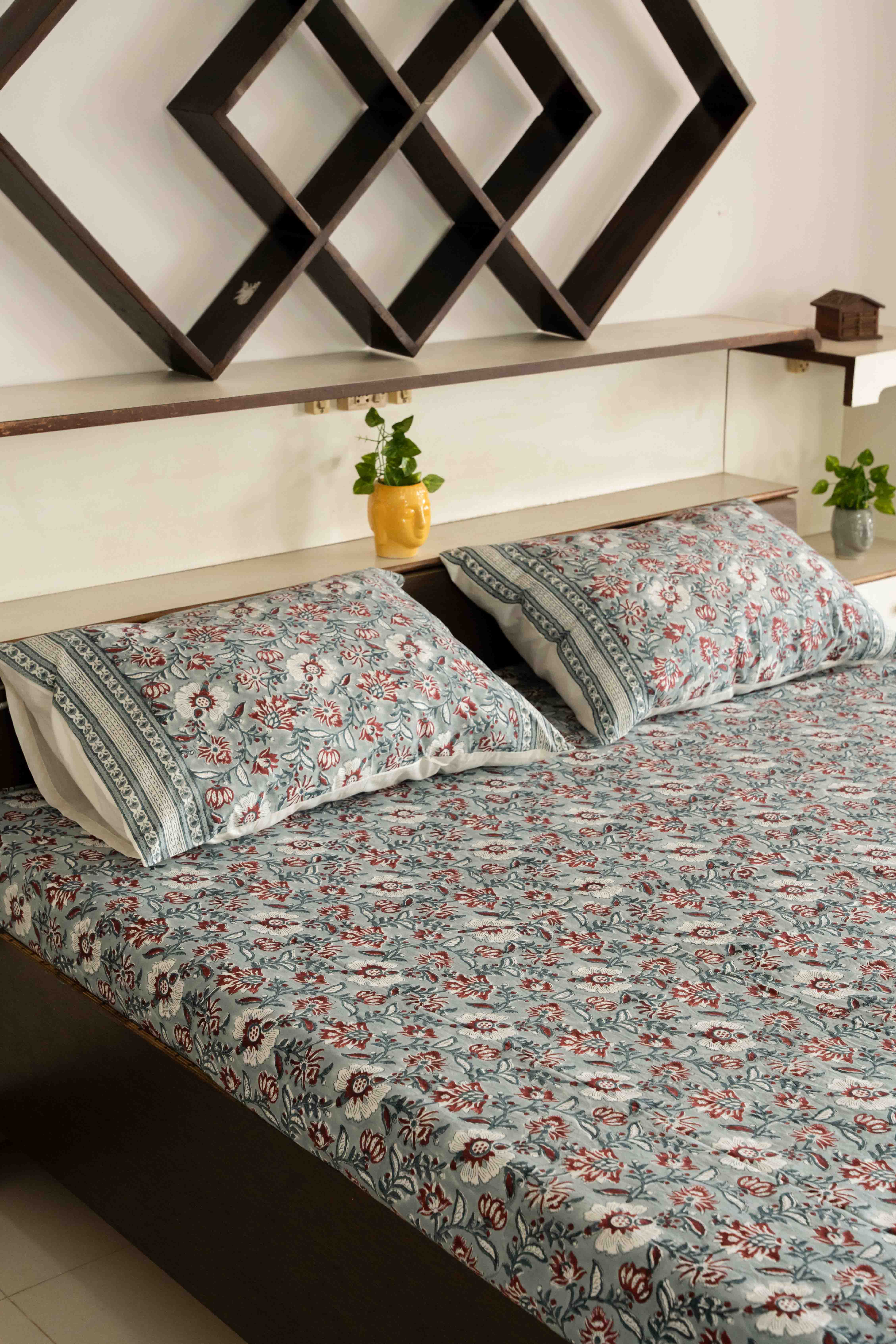 This fitted bed sheet is having beautiful contemporary floral design hand block printed in 100% premium percale cotton fabric. Our bed sheets are individually hand-printed using ancient woodblock printing technique. Delightfully crisp and smooth, these cotton sheets are refreshing additions to a well-curated bed.