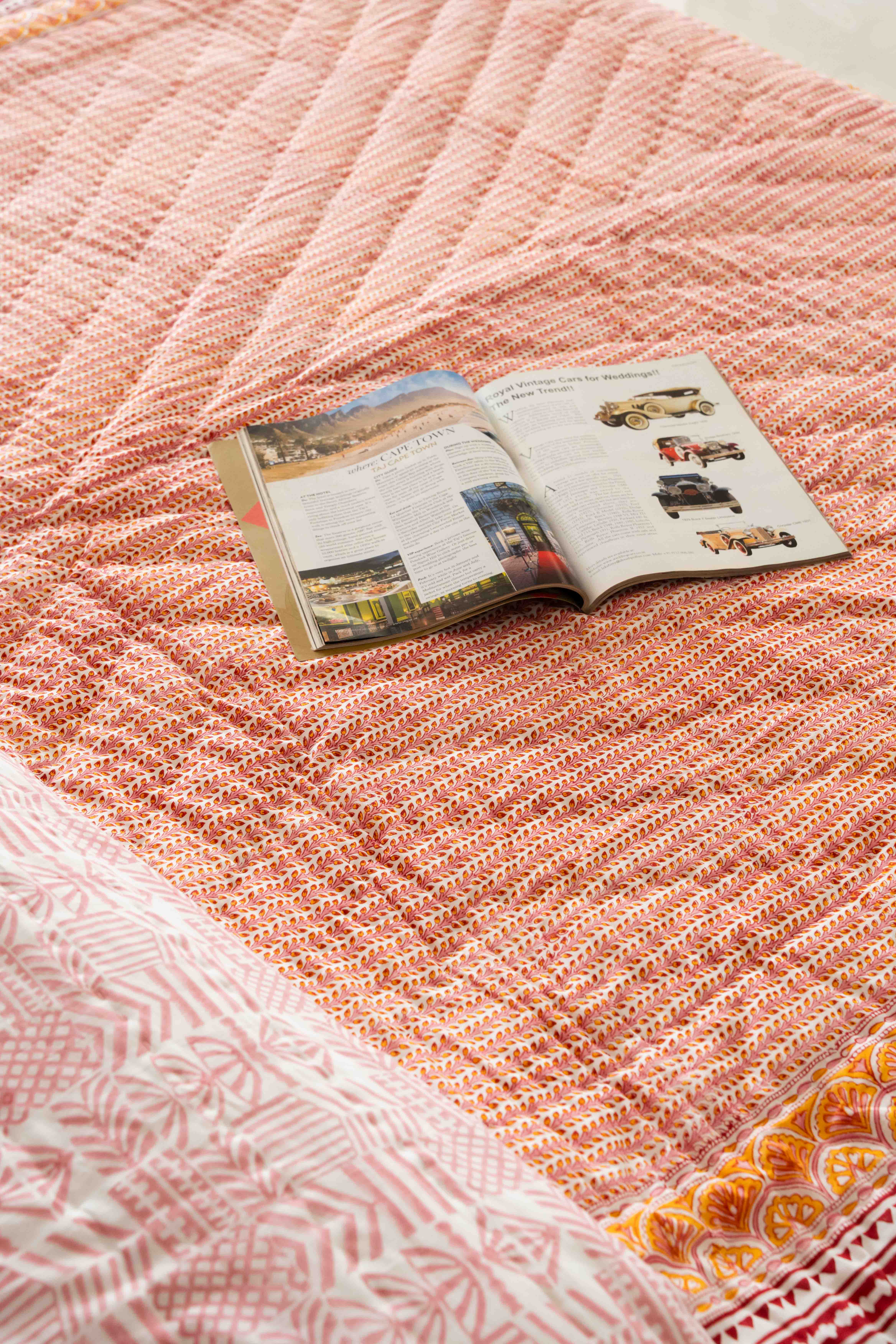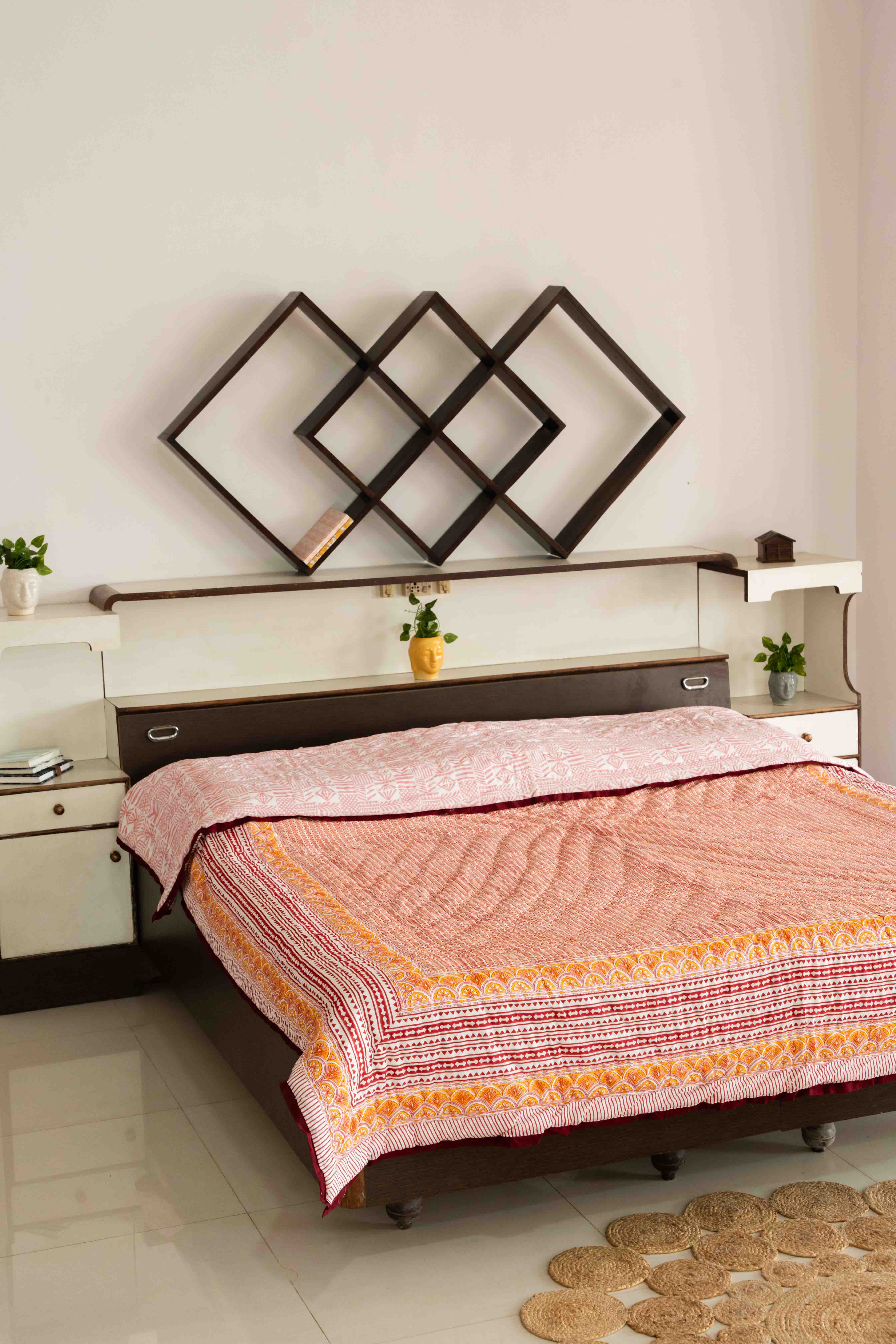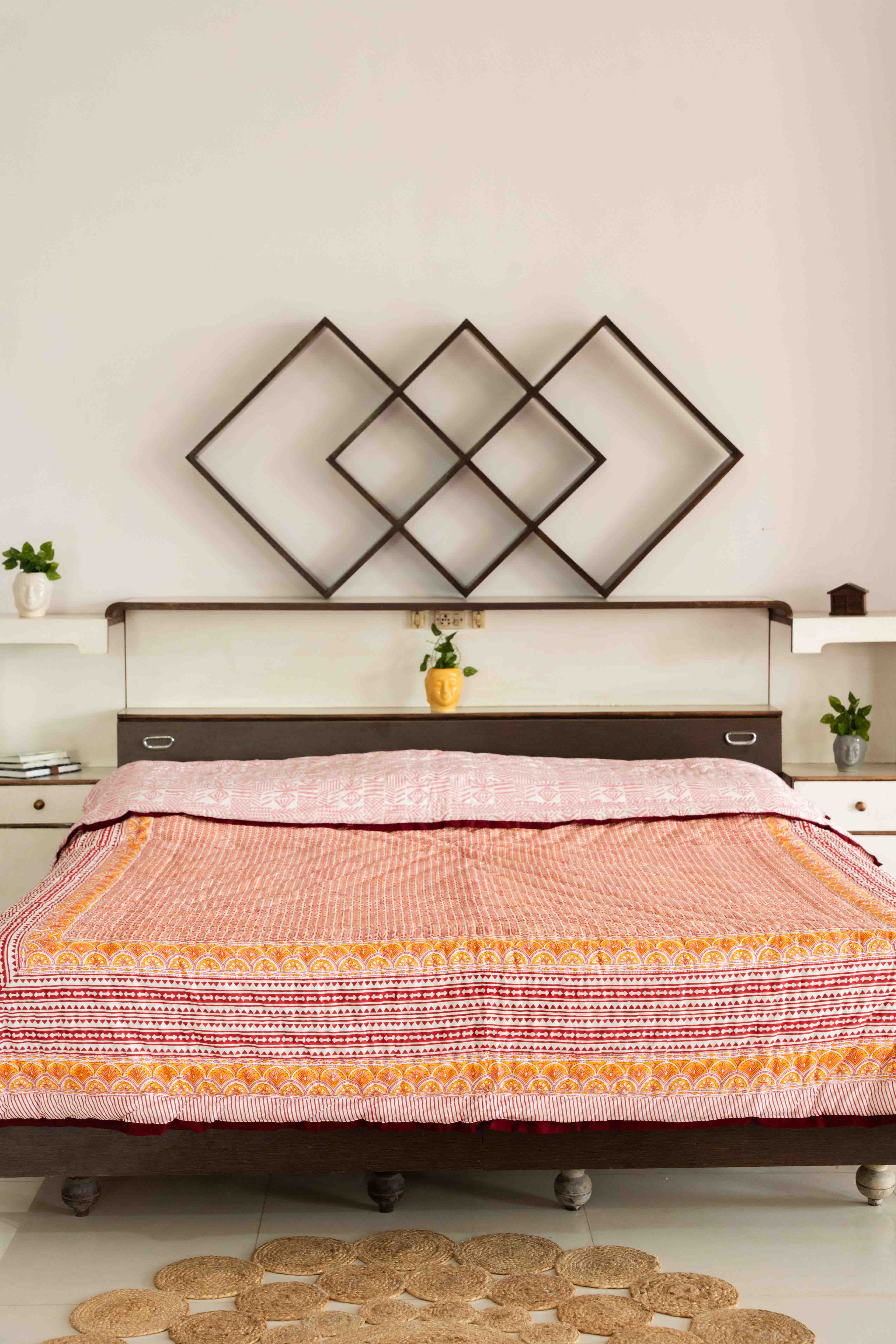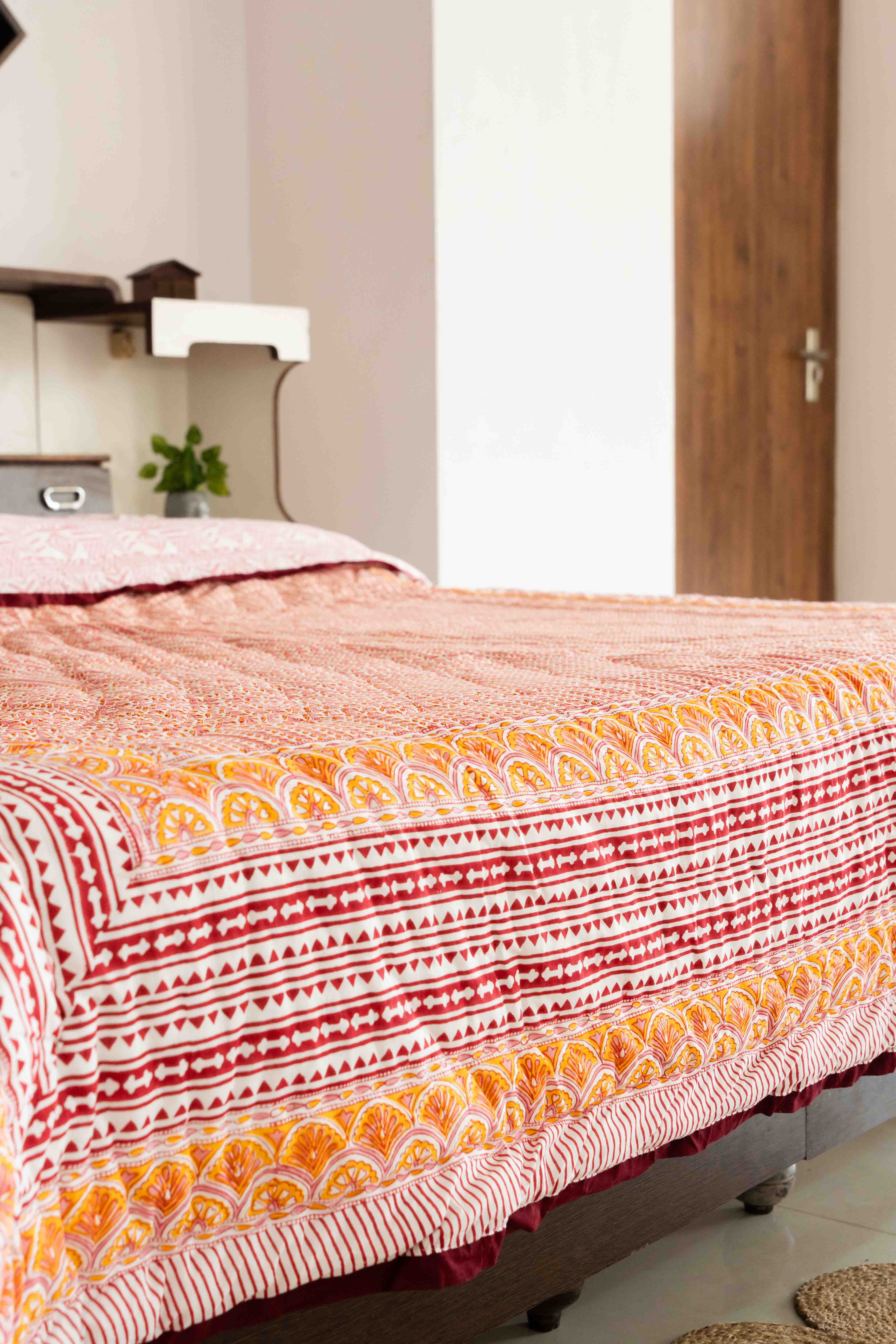 Our Cotton Quilt is hand block printed with a all over beautiful pattern with a beautiful boho border and reversible prints. The quilt is finished with small kantha stitches that are done by hand. A light weight cotton batting is sandwiched between two layers of super soft muslin fabric and then hand quilted. The cotton fabric makes the quilt breathable and perfect for use round the year.