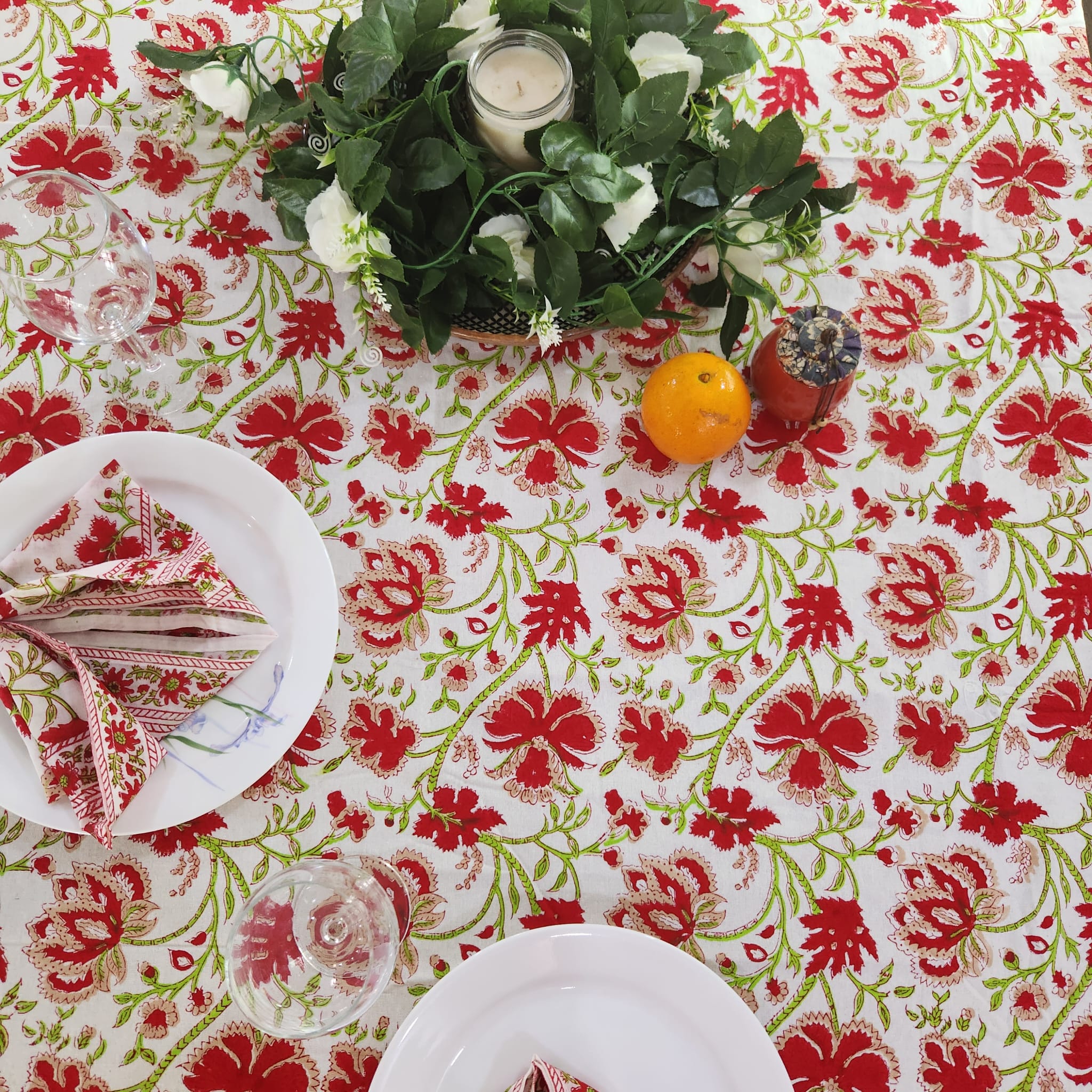 - Block printed napkins having red floral print